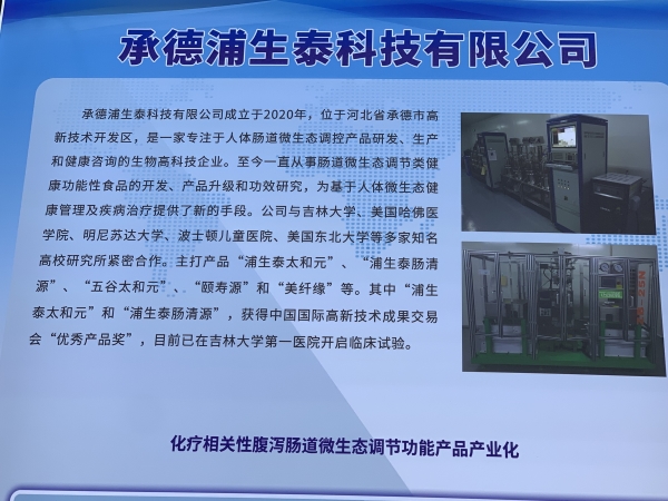 承德浦生泰科技有限公司成立于2020年,是一家专注于人体肠道微生态调控产品研发、生产和健康咨询的生物高新科技企业。至今一直从事肠道微生态调节类健康功能性食品的开发、产品升级和功效研究,为基于人体微生态健康管理及疾病治疗提供了新的手段。公司与吉林大学、美国哈佛医学院、明尼苏达大学、波士顿儿童医院、美国东北大学等多家知名高校研究所紧密合作。主打产品“浦生泰太和元”、“浦生泰肠清源”、“五谷太和元”、“颐寿源”和“美纤缘”等。其中“浦生泰太和元”和“浦生泰肠清源”,获得中国国际高新技术成果交易会“优秀产品奖”,目前已在吉林大学第一医院开启临床试验。