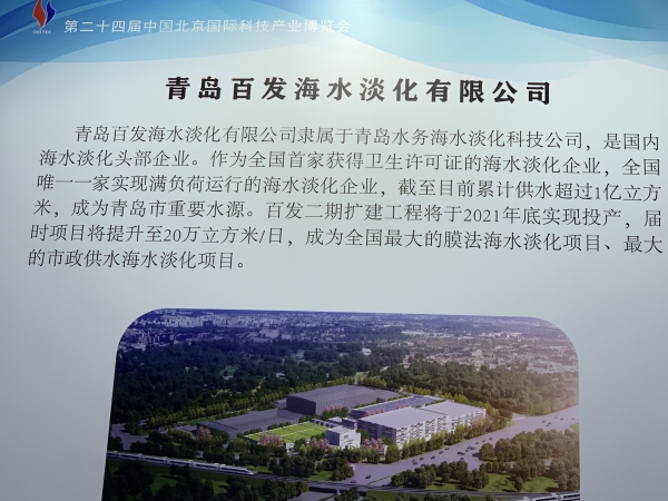 青岛百发海水淡化有限公司隶属于青岛水务海水淡化科技公司,是国内海水淡化头部企业。专业从事开发、建造、拥有、运营和维护海水淡化工厂,生产和销售淡化水、中小型海水淡化设备以及开发和经营与水相关的副产品及业务。公司于2014年取得卫生许可证,是全国首家获得卫生许可证的海水淡化企业;2017年单日水量达到10.5万立方米,是全国唯一一家实现满负荷运行的海水淡化企业;截至目前,累计供水超过1亿立方米,已经成为青岛市重要水源,对保障青岛市城市供水及改善饮用水水质起到了重要作用。2020年启动的百发二期扩建工程,将于年底实现投产,届时项目产能将提升至20万立方米/日,成为全国最大的膜法海水淡化项目、最大的市政供水海水淡化项目。