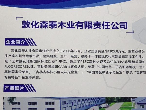 敦化森泰木业有限责任公司成立于2005年12月,企业注册资金为1205.8万元。主营业务为生产实木复合地板产品,是集研发、生产、 经营、服务于一体的现代化木制品精深加工企业。是“艺术拼花地板国家标准起草”单位。通过了PEFC森林认证及CARB/EPA认证和美国的 FLoorscore认证,首批美国加州CARBⅡ环保认证。荣获“中国特色、仿古旧木地板”生产基地国家级荣誉,“吉林省科技小巨人认定企业”,“中国地板绿色示范企业”以及“吉林省专精特新”企业等荣誉。