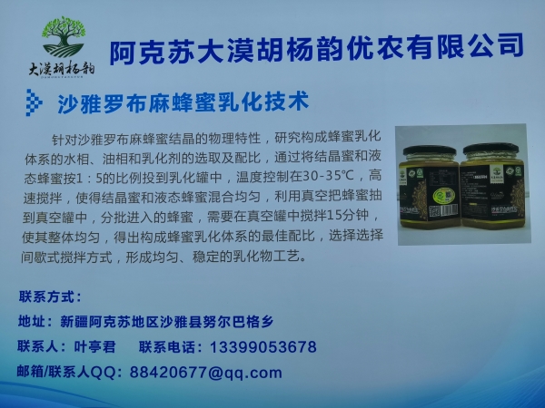 公司位于阿克苏沙雅县,主营蜂蜜 干果系列产品,罗布麻茶蜂蜜和罗布麻茶已取得国家绿色食品 国家地理标志产品,并多次获得北京农博会产品金奖。