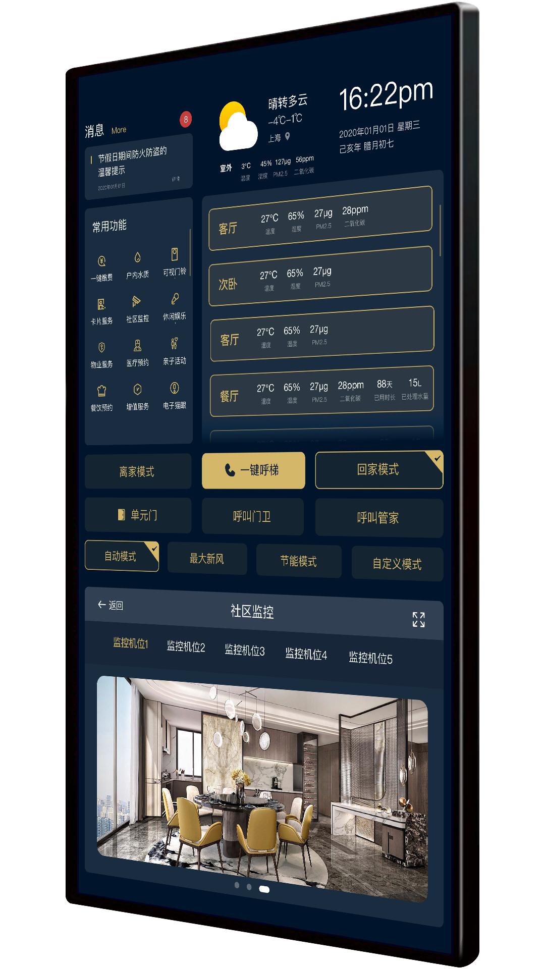 智能大屏以高端住宅为平台,通过物联网技术将小区内各区域以及家庭的各种设备连接到一起,实现智能化的一种生态系统设备。它具有智能灯光控制、智能电器控制、安防监控系统、可视对讲系统、智能化梯控等功能。利用网络通信技术、安全防范技术、自动控制技术、音视频技术集成家居生活有关的设施,提升家居安全性、便利性、舒适性、艺术性,并实现环保节能的居住环境。